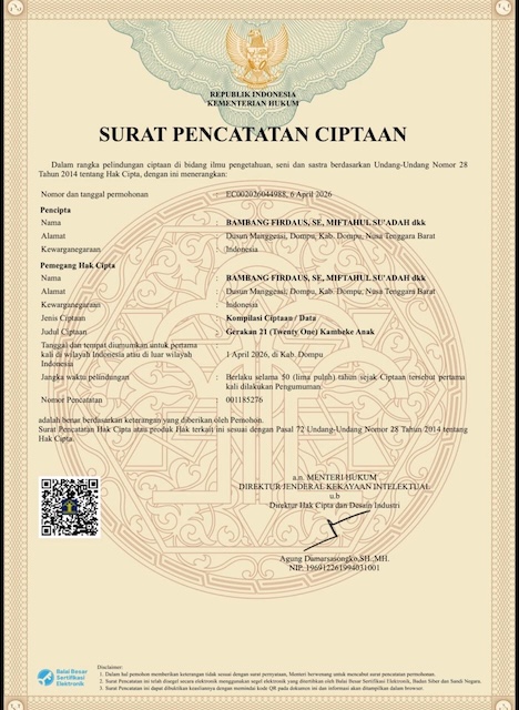 DOMPU — Kabupaten Dompu kembali menegaskan jati dirinya sebagai daerah yang inovatif. Terbaru, Dompu resmi memperoleh sertifikat Hak Cipta atas gagasan perlindungan anak bertajuk “Gerakan 21 (Twenty One) Kambeke Anak”, sebuah inovasi sederhana namun sarat makna yang berakar dari kearifan lokal.